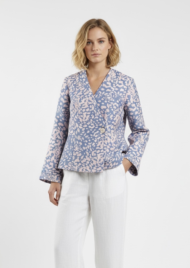 Crafted from 100% jacquard-woven cotton, this statement jacket showcases an exclusive fabric design by Karl Korsar — known for his bold yet refined visual language. The intricate jacquard weave brings depth and texture to the soft pink and muted blue abstract pattern, giving the piece an artful, contemporary feel.